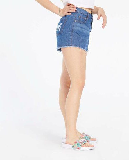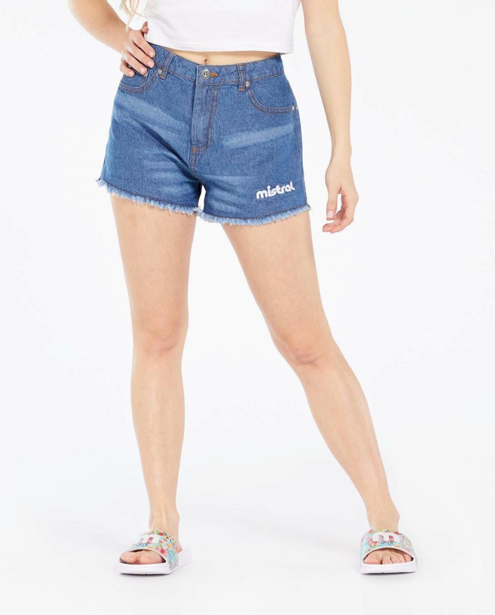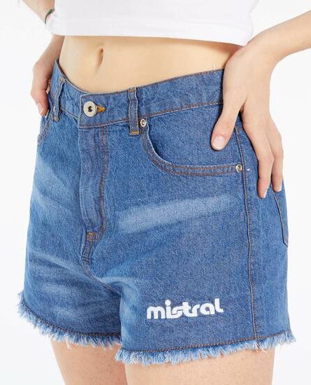 Pantalón corto Mistral vaquero, cómodo y fresco, con nombre de la marca en la parte delantera y logo en el bolsillo trasero, terminación del camal con flecos, tela con efecto desgastado, tu compañero ideal en tus sesiones de surf.