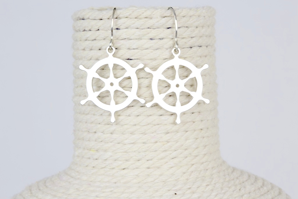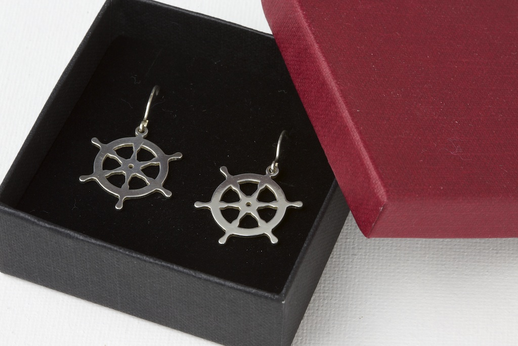 Pendientes timón de plata de ley. Se entregan con caja de regalo. Van a juego con colgante de timón en plata de ley con cordón de cuero o colgante de timón con cadena de plata (no incluidos).