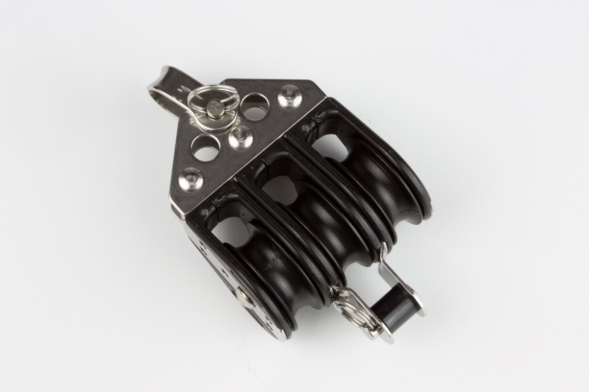 Polea triple con arraigo de 28 mm para cabos de hasta 8 mm