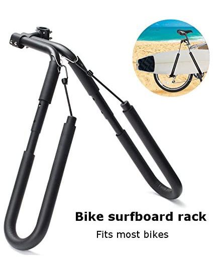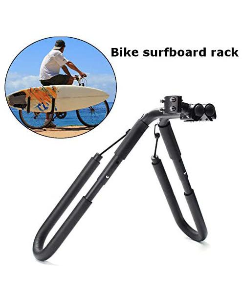 Porta tabla Rack Bicicleta, fabricado en metal resistente, cuerda elásticas para una mayor sujeción, asas porta tabla acolchadas para evitar roces, para tablas hasta 8 pies. De fácil limpieza y colocación.