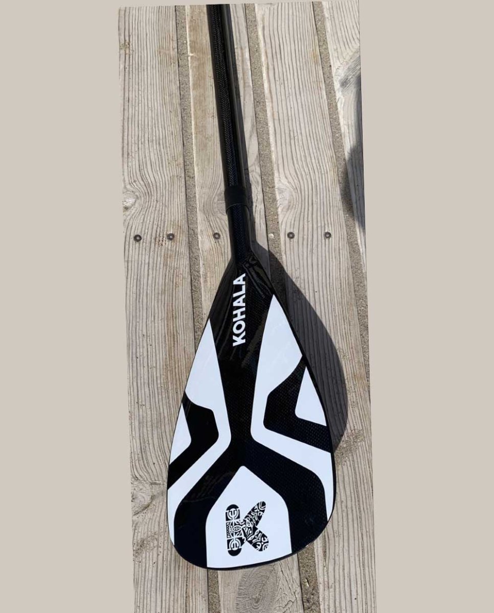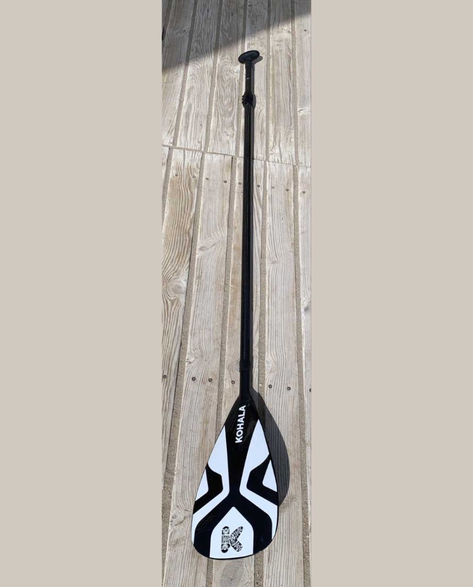 Remo Paddel Surf Kohala Carbono, desmontable y en dos piezas, mástil de carbono extensible para alturas de 170 a 210 cm con clip de ajuste fácil y cómodo de usar, fabricado con una varilla de carbono integrada que le proporciona una extrema ligereza y una excelente flexión, pala de plástico con salva aguas integrado.