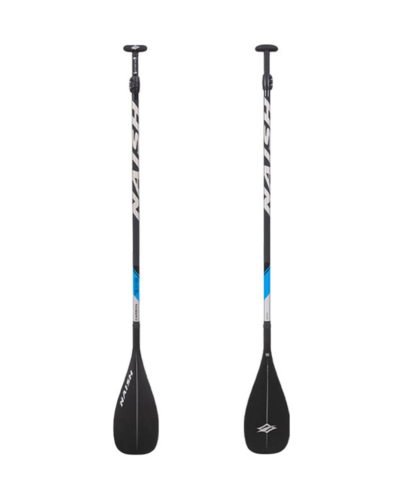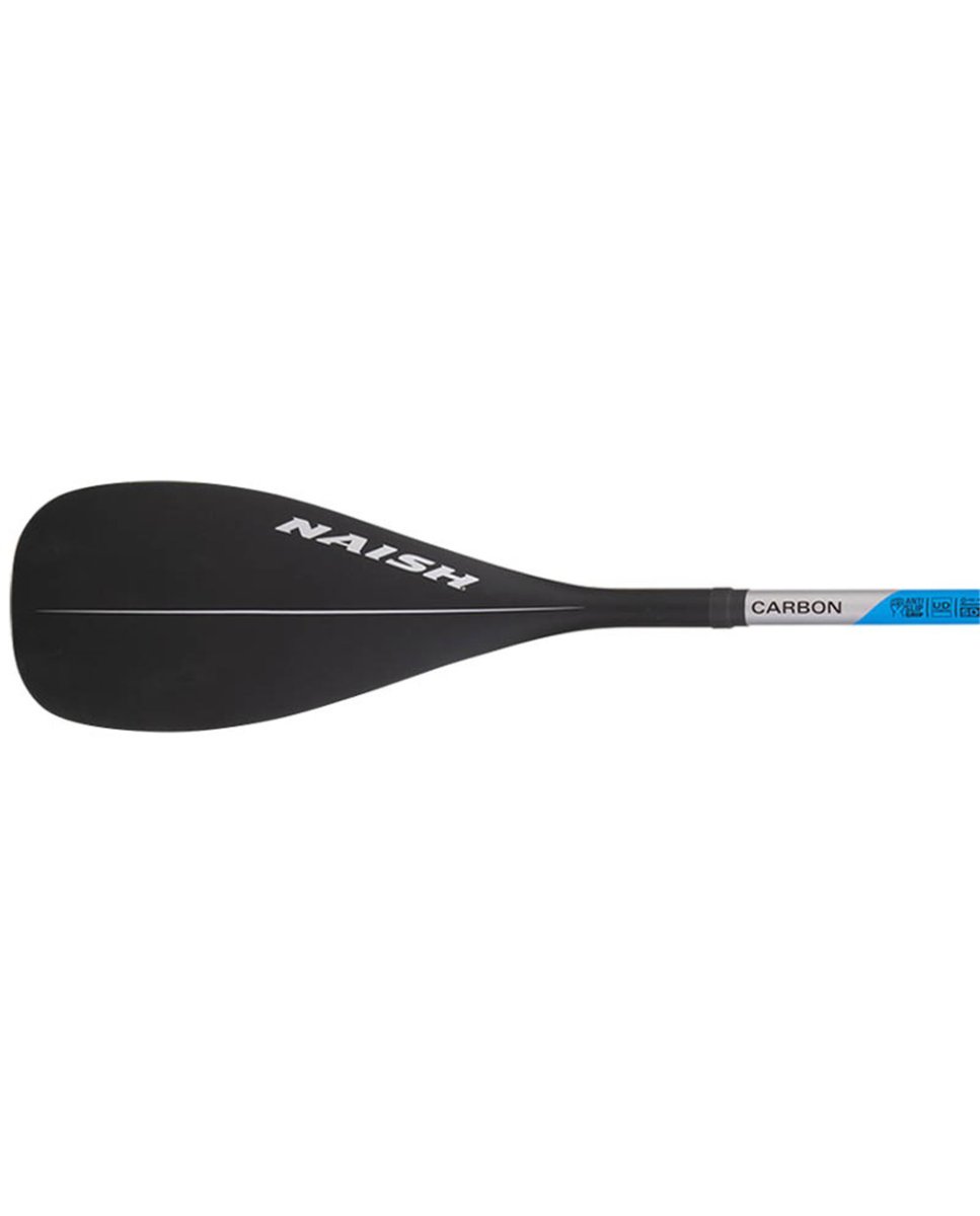 Remo Paddel Surf Naish Carbon Vario SDS S27, desmontable y en dos piezas, mástil de carbono con agarre de tracción en la zona inferior de la mano para evitar deslices, extensible para alturas de 170 a 210 cm con clip de ajuste fácil, sistema antigiro y cómodo de usar, fabricado con una varilla de carbono integrada que le proporciona una extrema ligereza y una excelente flexión, riel ABS para una mayor protección contra daños, eje reforzado con carbono UD Biax Glass duradero, pala de carbono con salva aguas integrado, mango en T estilo tahitiano con agarre de tracción.
