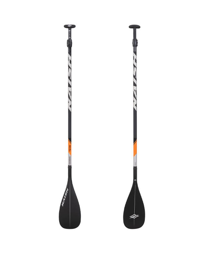 Remo Paddle Surf Naish Performance Vario SDS 85 S27, desmontable y en dos piezas, mástil de carbono con agarre de tracción en la zona inferior de la mano para evitar deslices, extensible para alturas de 170 a 210 cm con clip de ajuste fácil, sistema antigiro y cómodo de usar, fabricado con una varilla de carbono integrada que le proporciona una extrema ligereza y una excelente flexión, pala de carbono con salva aguas integrado, mango en T estilo tahitiano con agarre de tracción.