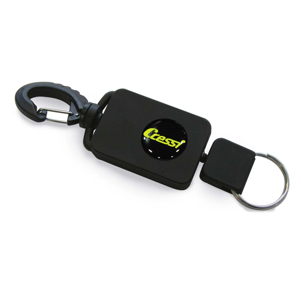 Mecanismo con cabo de acero retráctil para focos, cámaras o cualquier accesorio que se desee tener a mano y seguro. Mosquetón con ánima inox. para mayor seguridad + anilla inox.