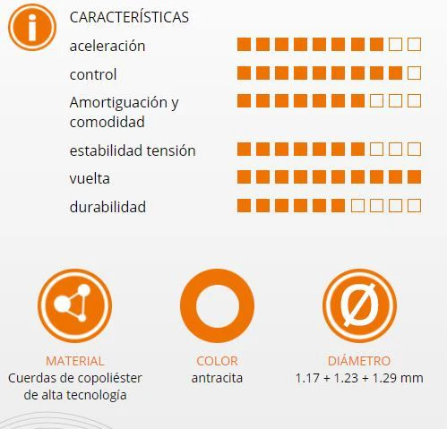 Rollo de Cuerda Signum Pro Tornado este cordaje de nuevo diseño en forma heptagonal está fabricado en dos pasos. El Signum Pro está diseñado con un nuevo molde heptagonal con el que se le da una primera forma; este es el primer paso. Una vez enfriado, se vuelve a calentar y se le gira entorno al eje central; este es el segundo paso. El giro y el doble calentamiento hace que este cordaje sea muy confortable y que la superficie, al ser rugosa, genere buenos efectos. El resultado de esta nueva técnica es un cordaje que combina agarre de la pelota, potencia y confort.