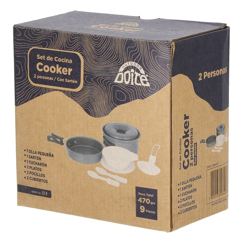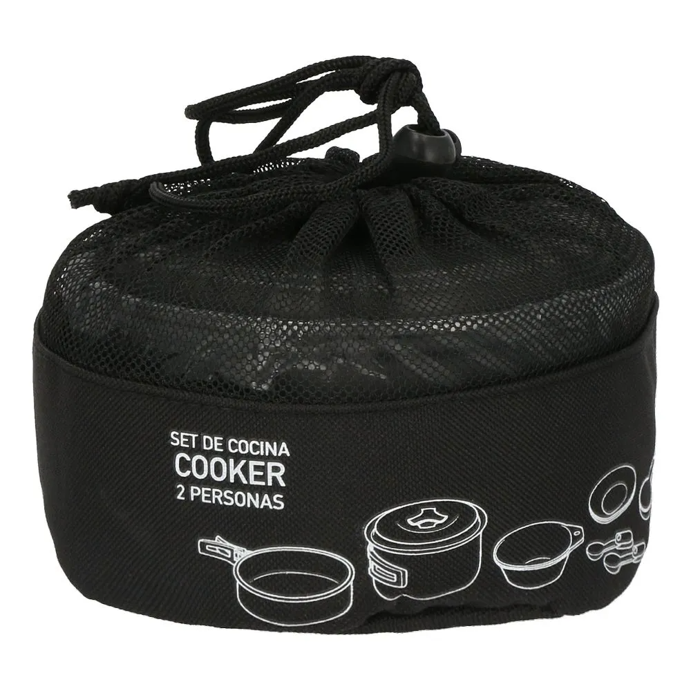 Set de cocina para 2 personas, ideal para camping y paseos al aire libre; debido a que optimiza el espacio. Incluye una bolsa de transporte. Peso total: 470 grs.
