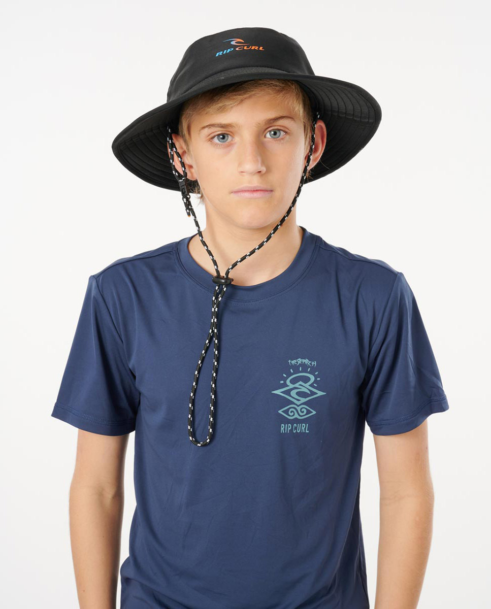 Sombrero Rip Curl Beach Niño (varios colores), 90% Poliéster 10% Elastano, FPS 50+, correa de barbilla ajustable con clip de seguridad, borde flotante suave y flexible, ala media, logo de la marca impreso, este sombrero protegerá a a los mas peques de los rayos del sol a la vez que mantiene un estilo divertido y relajado.