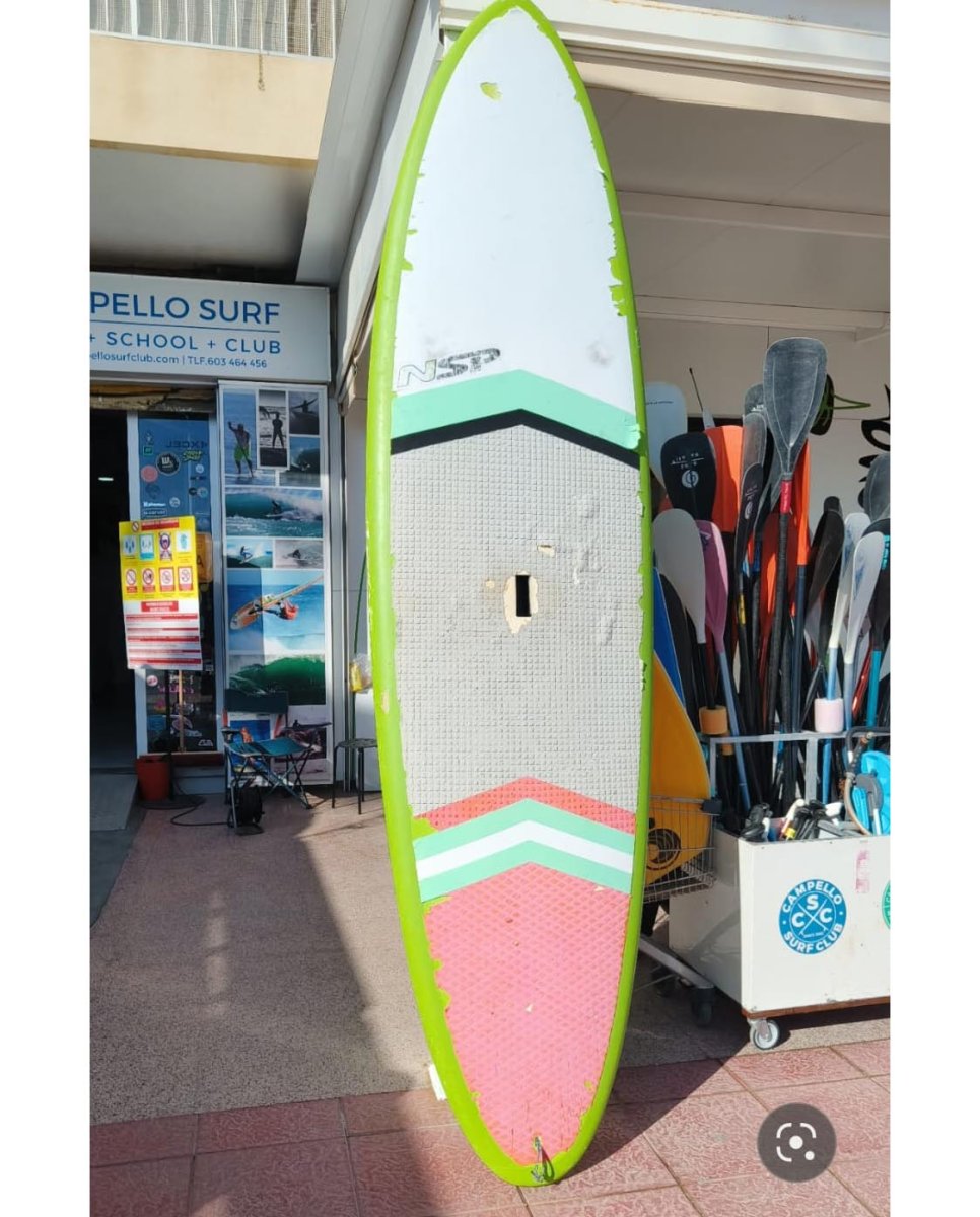 Tabla Paddle Nsp 10´6 , material de segunda mano, medida 10´6, rigida, asa de transporte central integrada, grip desgastado y despegado por varias zonas, varias reparaciones que no afectan a su funcionalidad, pérdida de color en algunas zonas, modelo olas.