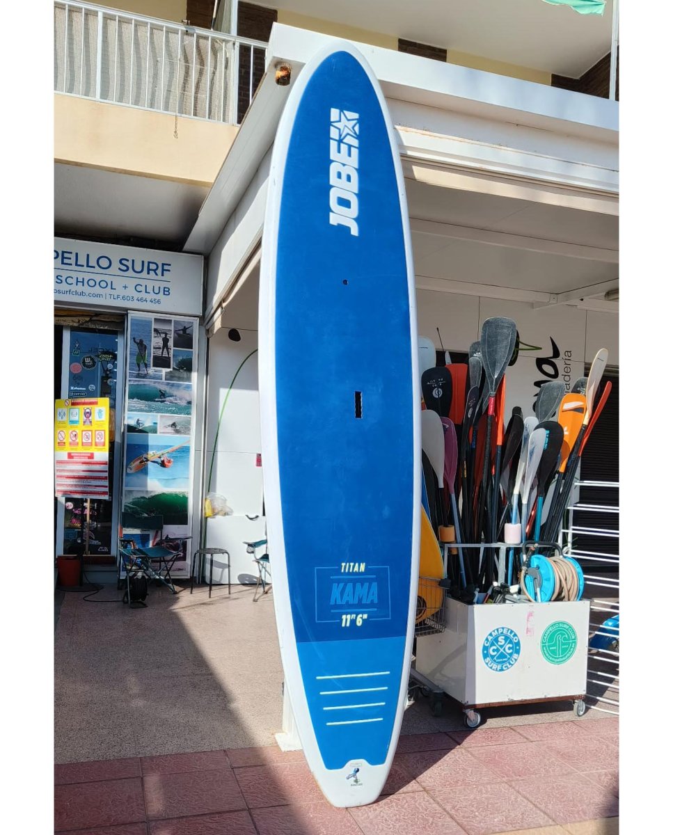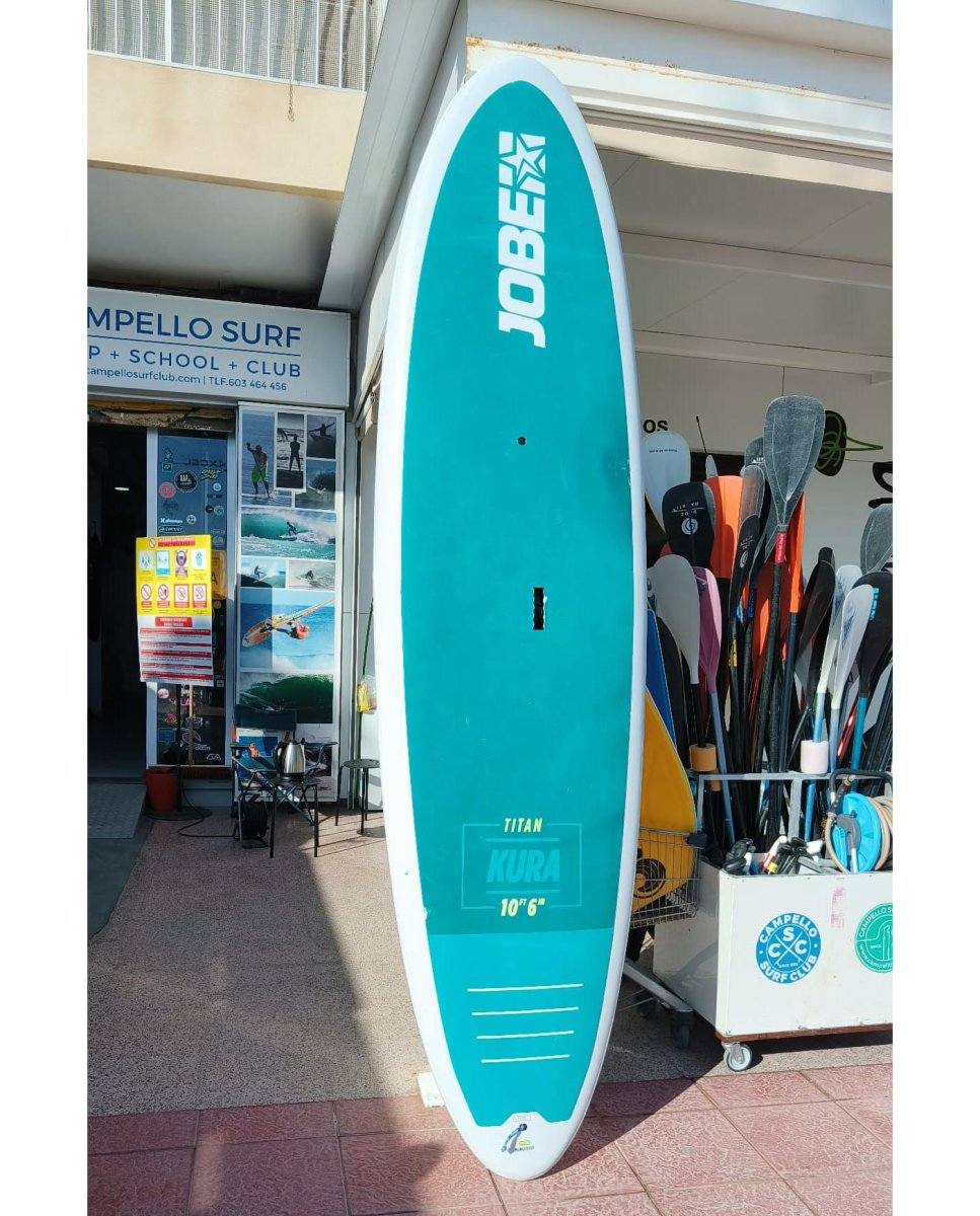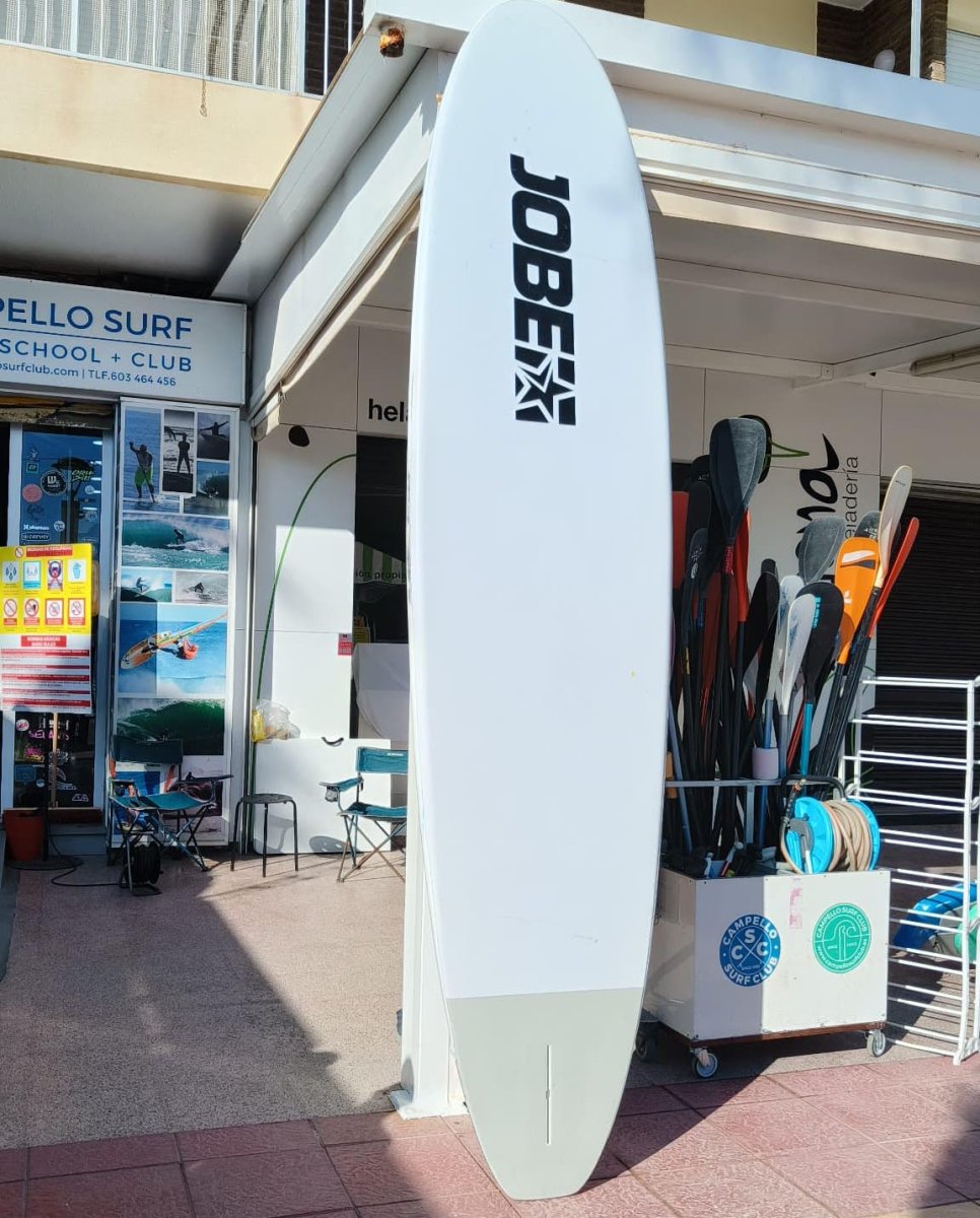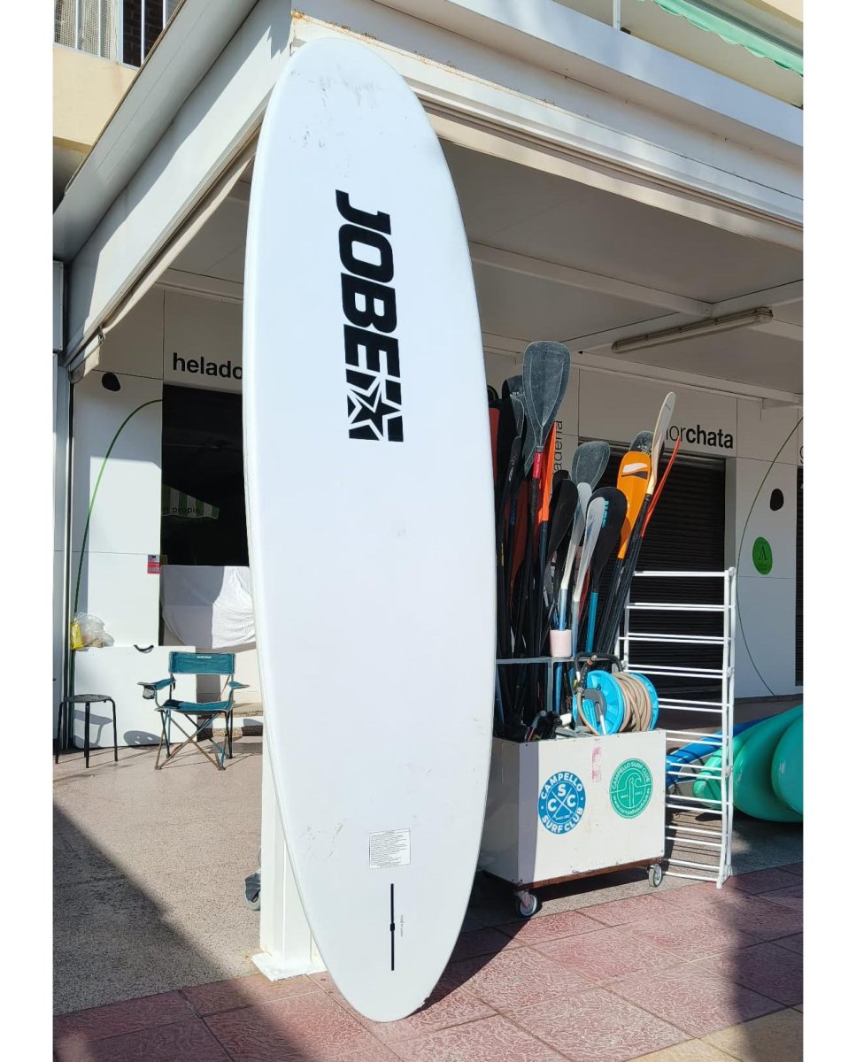 Tabla Paddle Surf Jobe (varias medidas), material de segunda mano, rígida, asa de transporte central integrada, grip completo, pérdida de color en algunas zonas, muy buen estado, sin reparaciones.