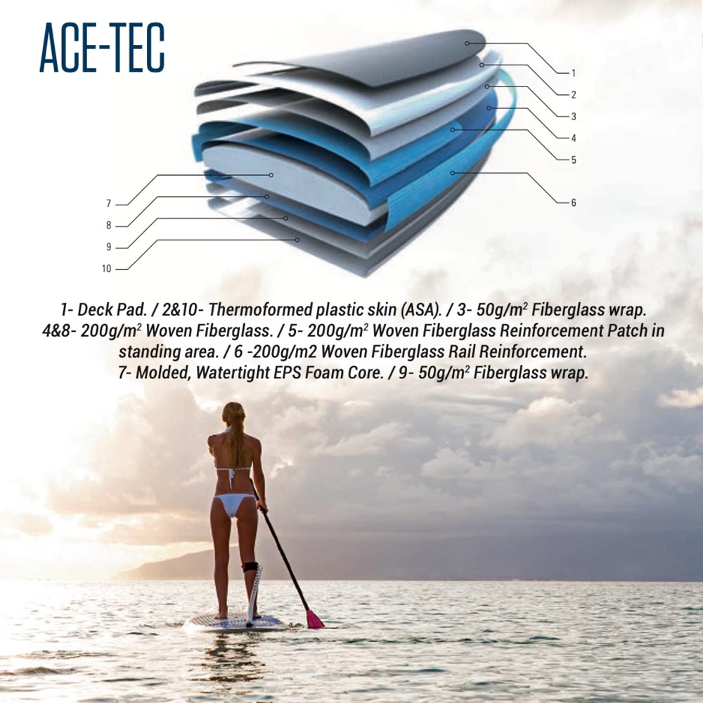 La tecnología para los paddle board AceTec añade un pad en EVA muy cómodo en su superficie, tablas de sup fabricadas en capas de fibra de vidrio que optimizan el rendimiento de la tabla en el agua y minimizan su peso. Para terminar la tabla se utiliza una capa de polietileno que protegerá el SUP de los golpes y garantizará la durabilidad de la tabla.