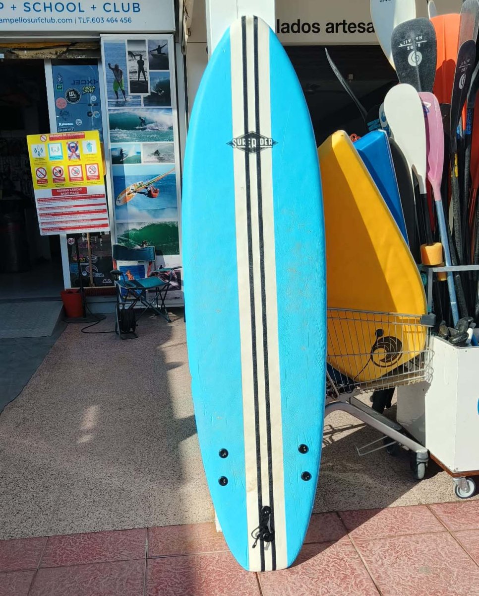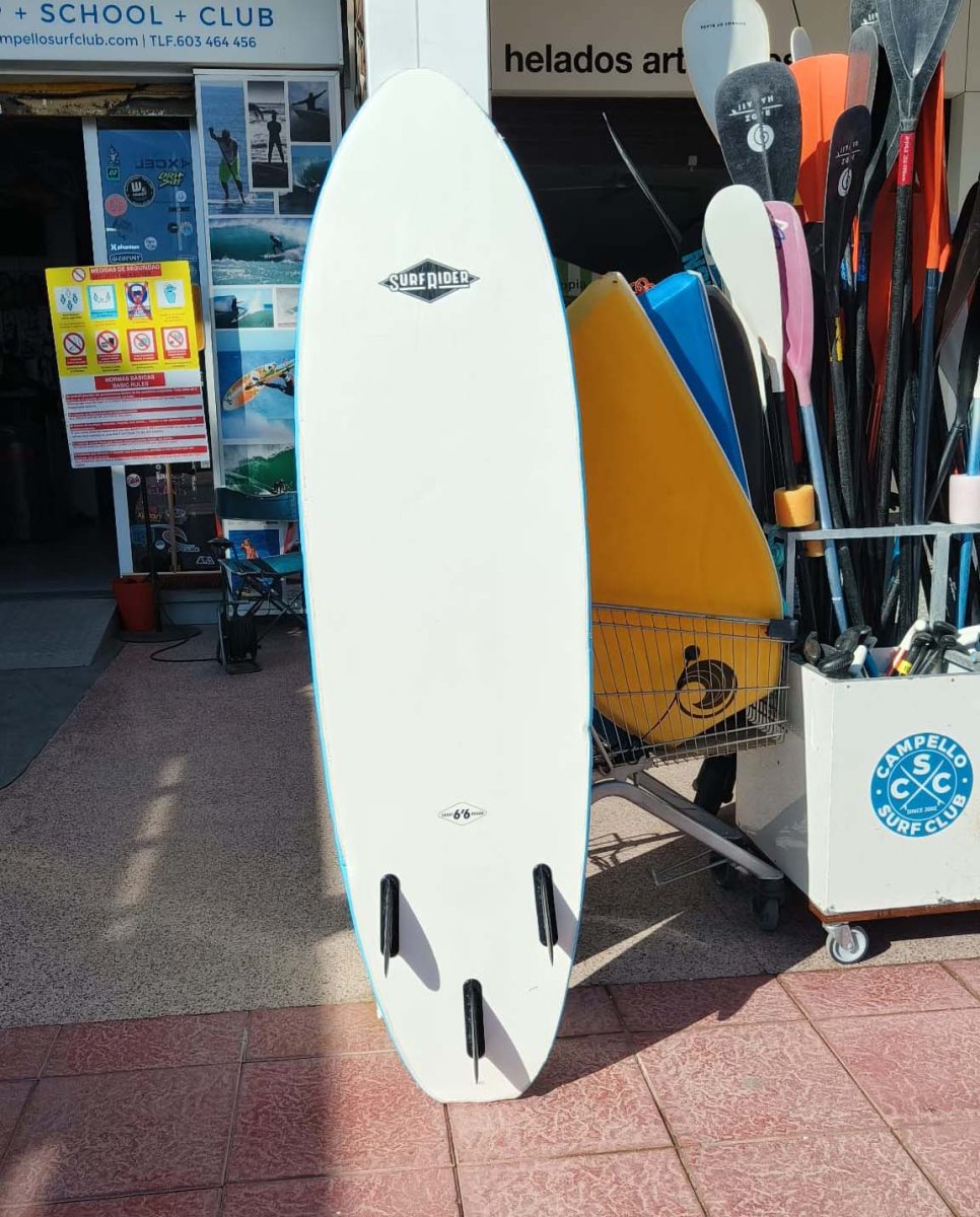 Tabla Surf Surf Rider 6´6″, material de segunda mano, medida 6´6″, soft board, nouse con partes despegadas, sin afectar a la funcionalidad, tail completo, deck completo sin reparaciones, pérdida de color en algunas zonas.