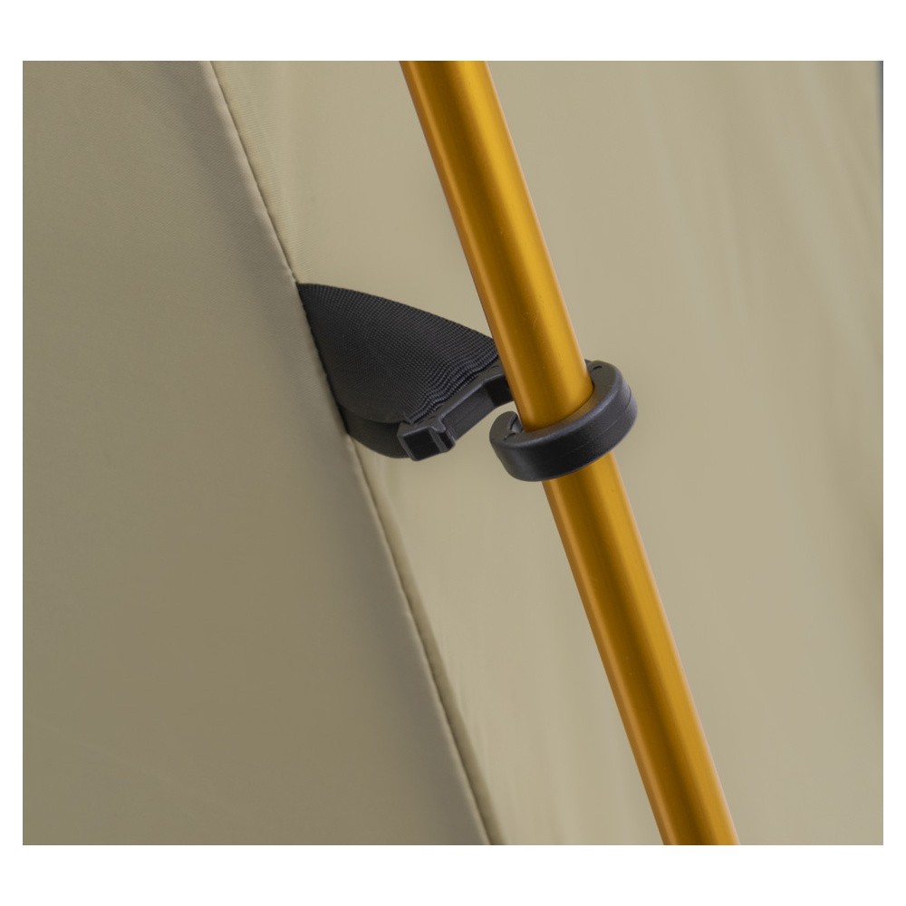 Para los postes (estructura), utilizamos aluminio de la serie 7000 de aleación de aviones que son fuertes y livianos. El montaje es realmente fácil con los clips de la carpa que simplemente encajan en su lugar sobre los postes. La sobre carpa de poliéster y el piso Oxford están recubiertos de uretano, con costuras selladas de fábrica para una máxima impermeabilidad. Las 2 puertas hacen que entrar y salir de la tienda sea mucho más fácil, especialmente en medio de la noche, cuando necesita salir. También dispone de 2 vestíbulos (uno sobre cada puerta) que puede utilizar para guardar cosas adicionales. Los vestíbulos también sirven como puntos de salida automáticos cuando el clima se pone un poco desagradable. La sobre-carpa se abrocha a la tienda, ofreciendo una sujeción mucho más segura en comparación con el cordón elástico. Las rejillas de ventilación del techo de malla aumentan la ventilación y mejoran la observación de las estrellas.