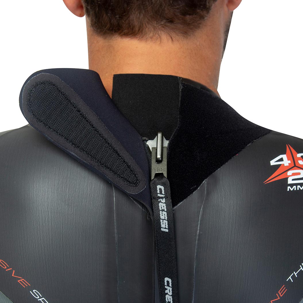 - Cuello con nuevo diseño escotado estudiado para evitar cualquier fricción alrededor del cuello, mientras mantiene un sellado perfecto contra la infiltración de agua. Acabados mediante dobladillo de neopreno liso 100% para optimizar y confort del traje evitando rozamientos.