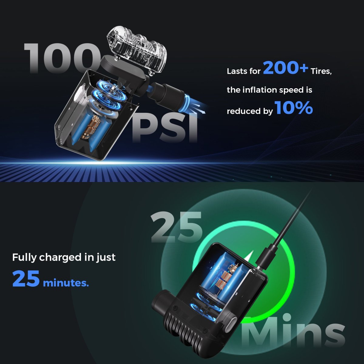 Con una batería de alta capacidad y la tecnología Airvortech, la TINY BIKE PUMP puede inflar dos llantas de 700*25c de 0 a 80 PSI con facilidad y alcanzar una presión máxima de 100 PSI. Es una herramienta confiable y poderosa que puede inflar un neumático a 80 PSI en tan solo 80 segundos.