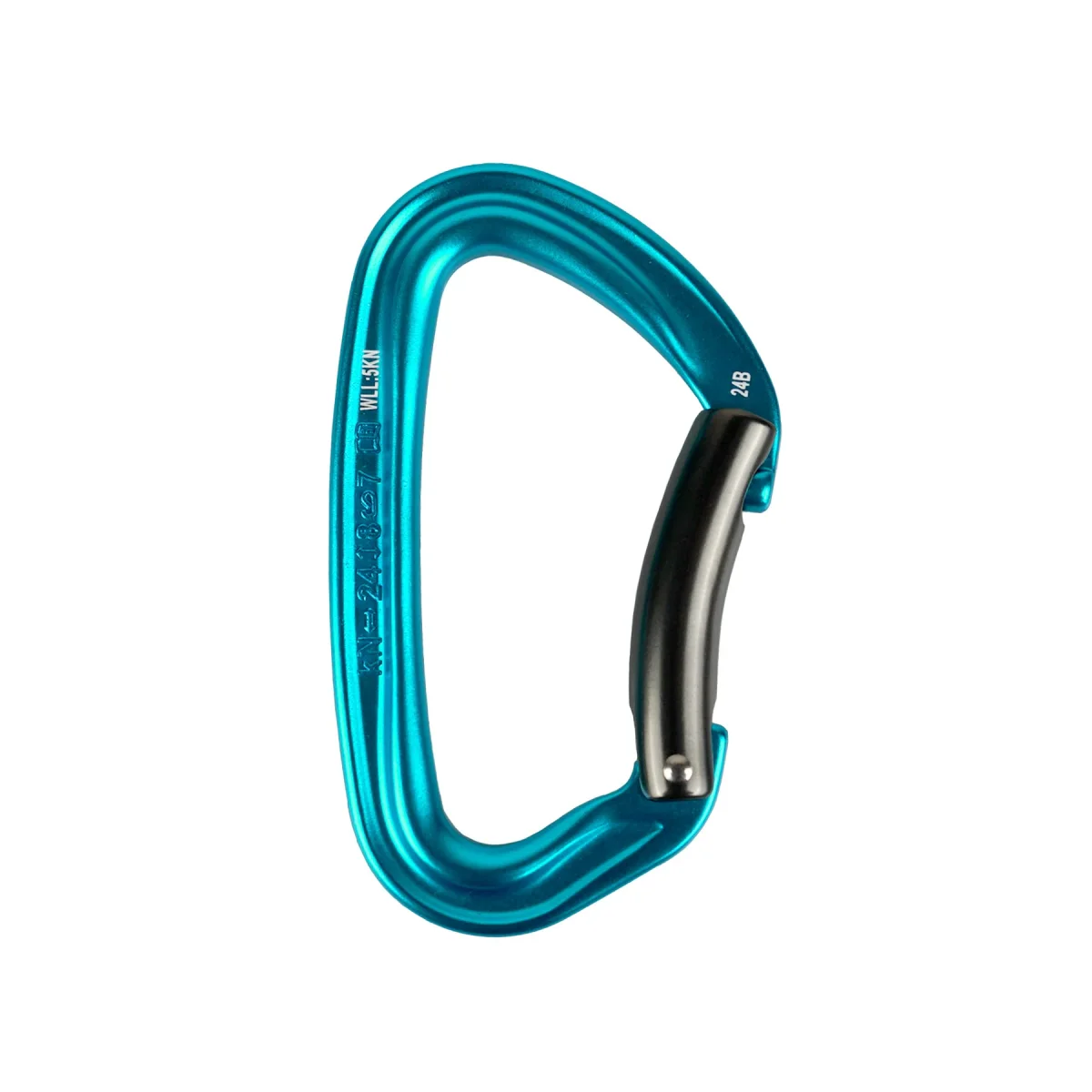 Mosquetón simple con una elegante apariencia anodizada en color azul. Fabricado en aleación de aluminio forjado en caliente por lo que su resistencia y peso reducido esta garantizado. Nariz o terminación tipo keylock, con una cabeza más pequeña que no se engancha en las chapas y permite un suave mosquetoneo.