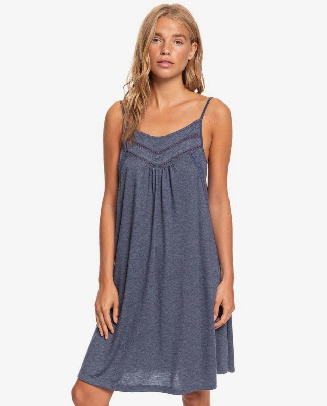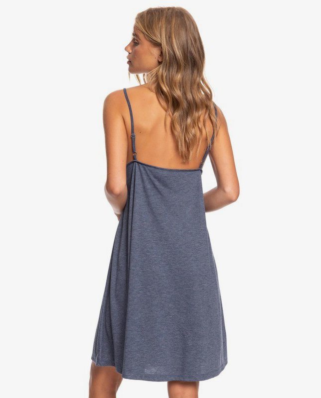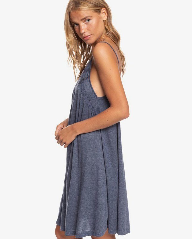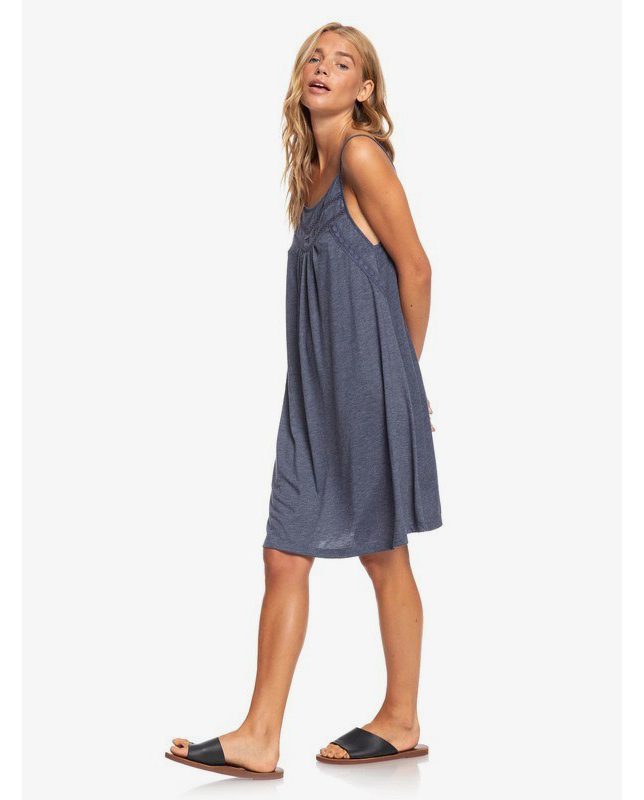 Vestido Roxy Rare Feeling, 65% poliéster 35% viscosa, de tirante fino regulable y espalda baja, escote redondo con panel bordado en canesú. De color azul jaspeado es una prenda cómoda, jovial y de mucho uso.
