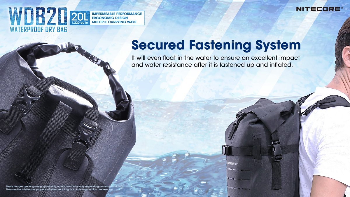 La Nitecore WDB20 es una bolsa seca diseñada para senderismo, deportes acuáticos y otras actividades al aire libre. Ofrece una excelente impermeabilidad, un diseño ergonómico y múltiples opciones de transporte. Con una capacidad de 20 litros, esta bolsa seca puede transportar su equipo de aventura, incluyendo equipo de buceo, ropa, dispositivos móviles, comida y más.